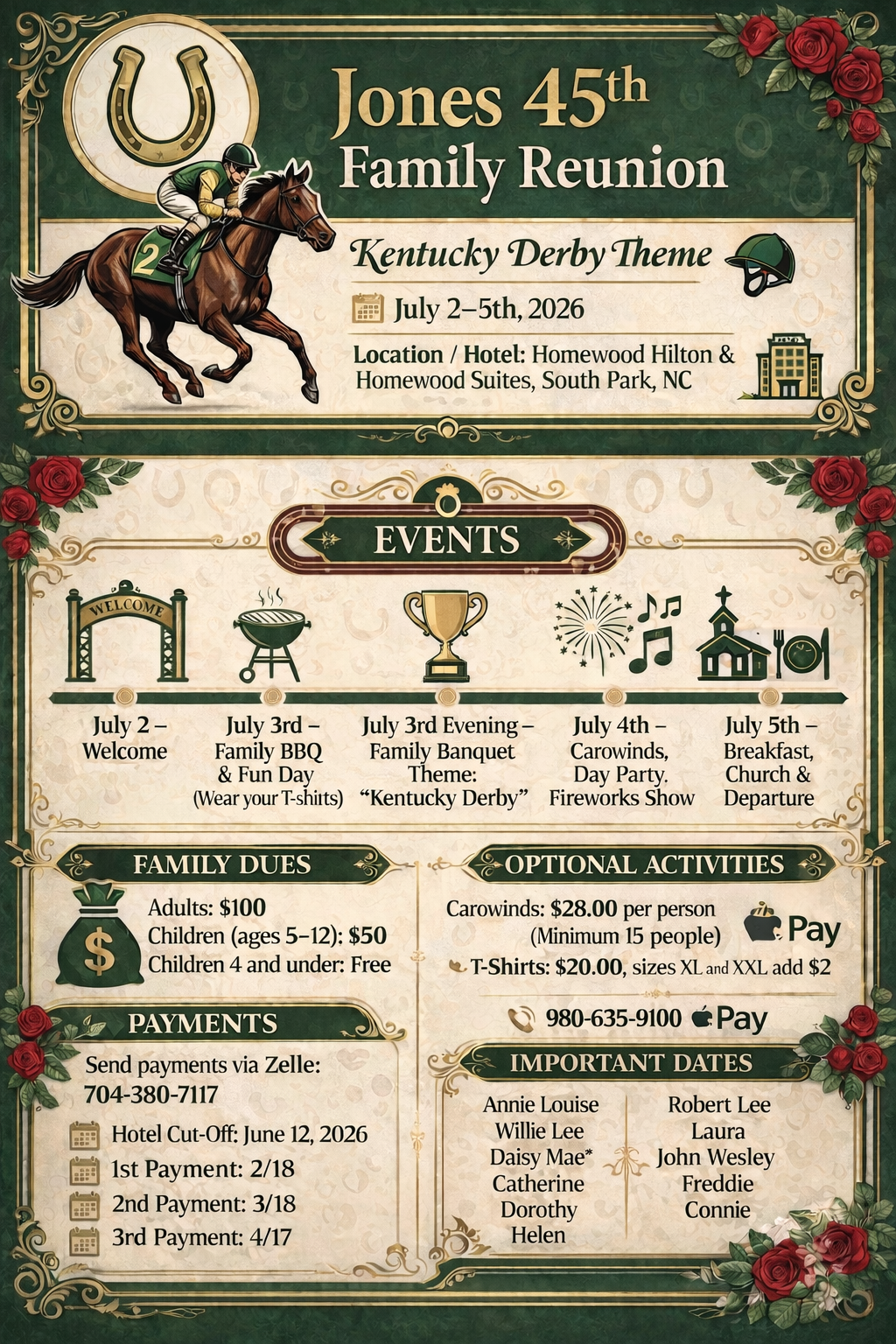 LATESTINFORMATION Final Payment Due May 1st ✳︎ Kentucky Derby Theme ✳︎ 45th Family Reunion ✳︎ Final Payment Due May 1st ✳︎ Kentucky Derby Theme ✳︎ 45th Family Reunion ✳︎ Final Payment Due May 1st ✳︎ Kentucky Derby Theme ✳︎ 45th Family Reunion ✳︎